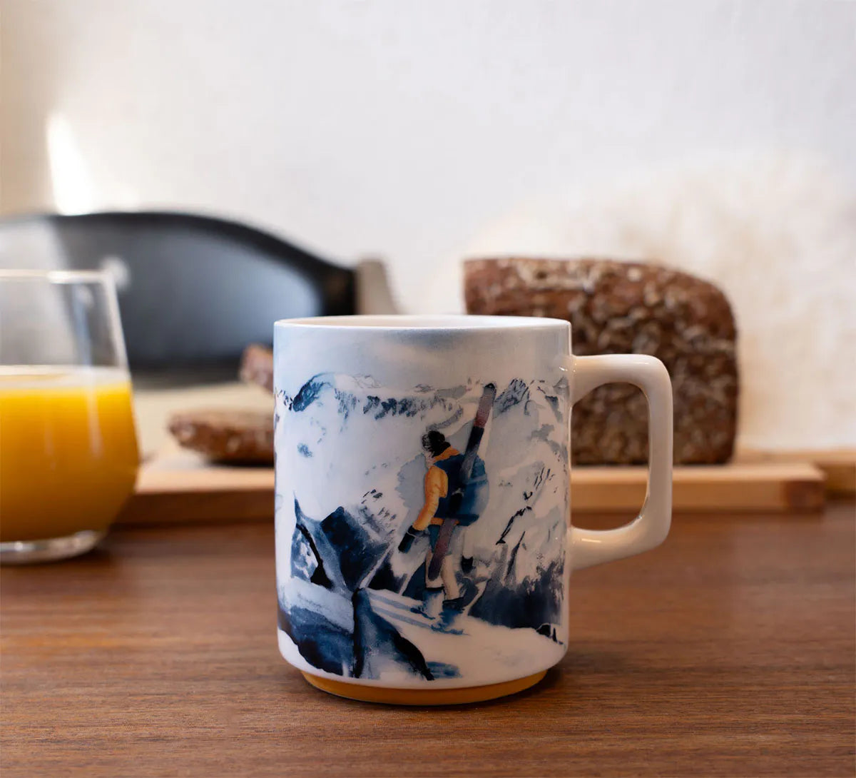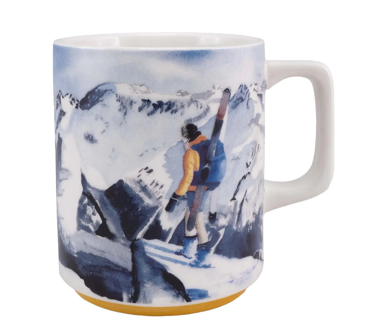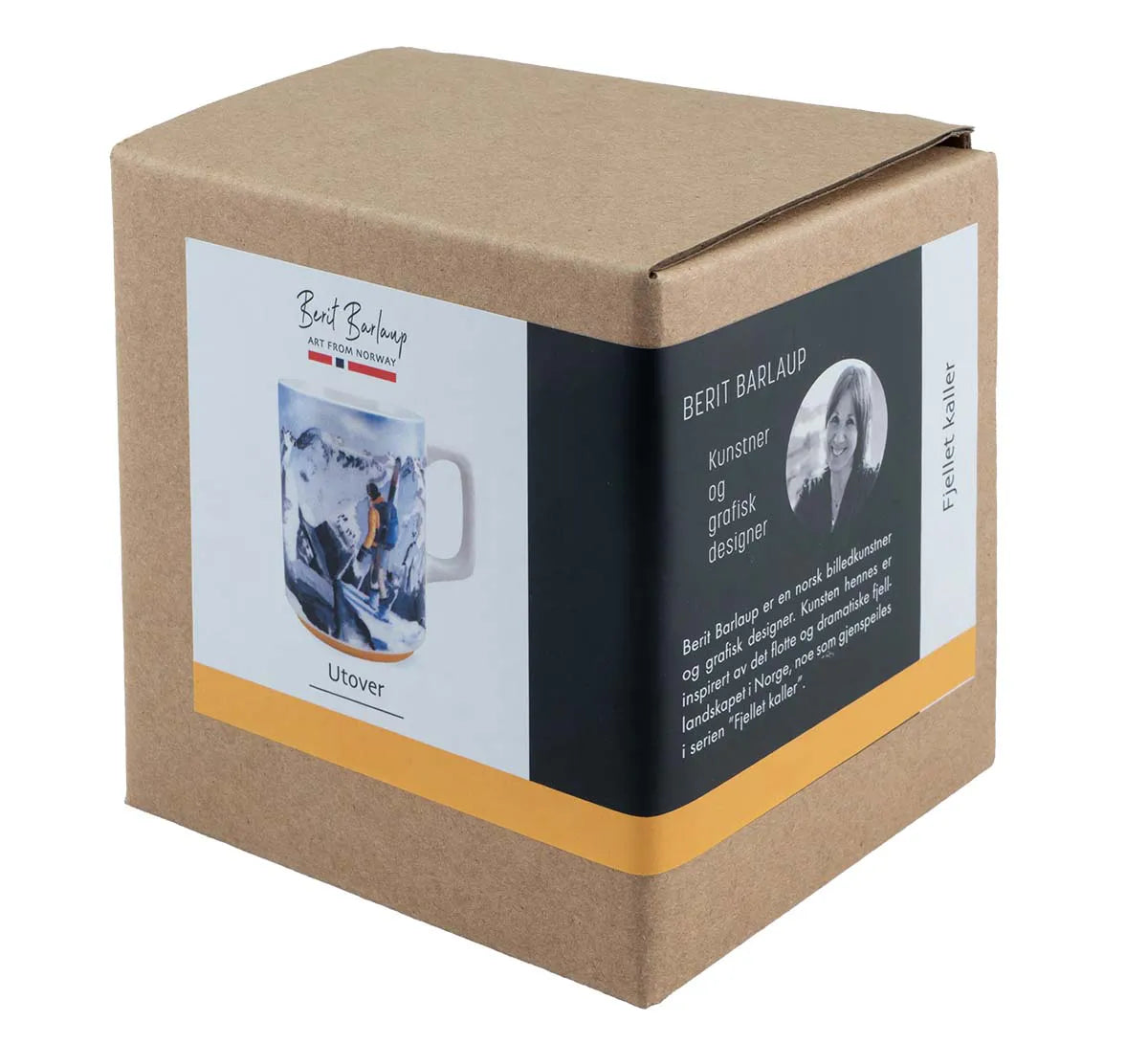 Nyt en varm drikke i dette stilrene kruset med motivet Utover fra serien Fjellet kaller. Motivet Utover er malt i vakre akvarellfarger og viser en skigåer på topptur som skuer utover norske vinterfjell. Dette er en perfekt kopp for de som elsker ski, alpint, randonee og topptur.