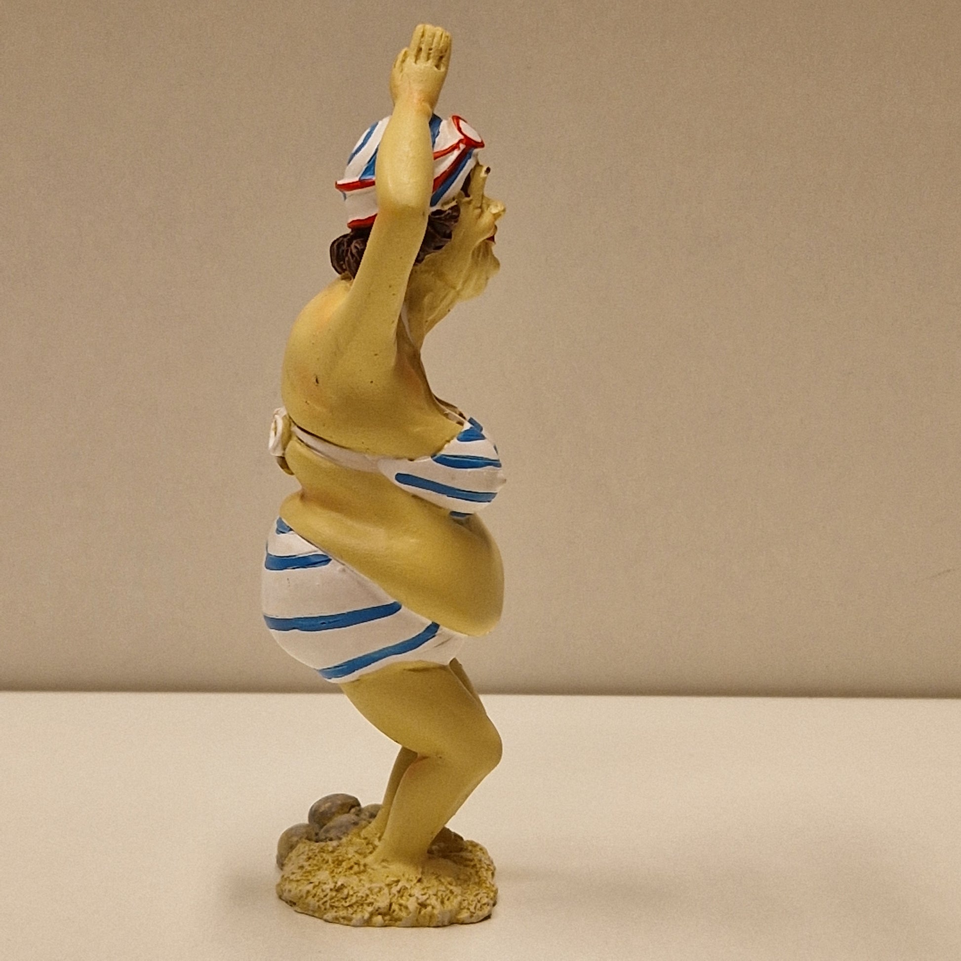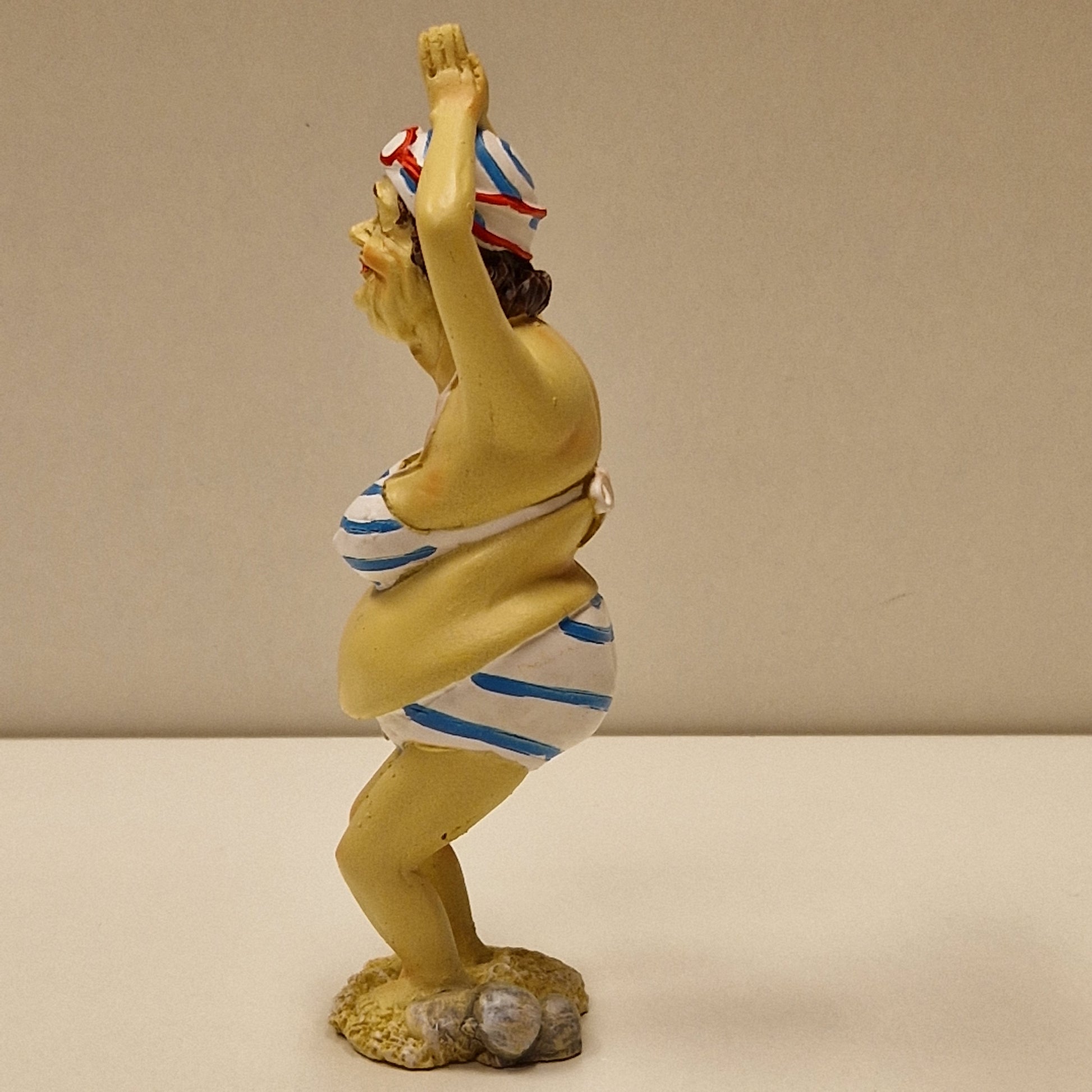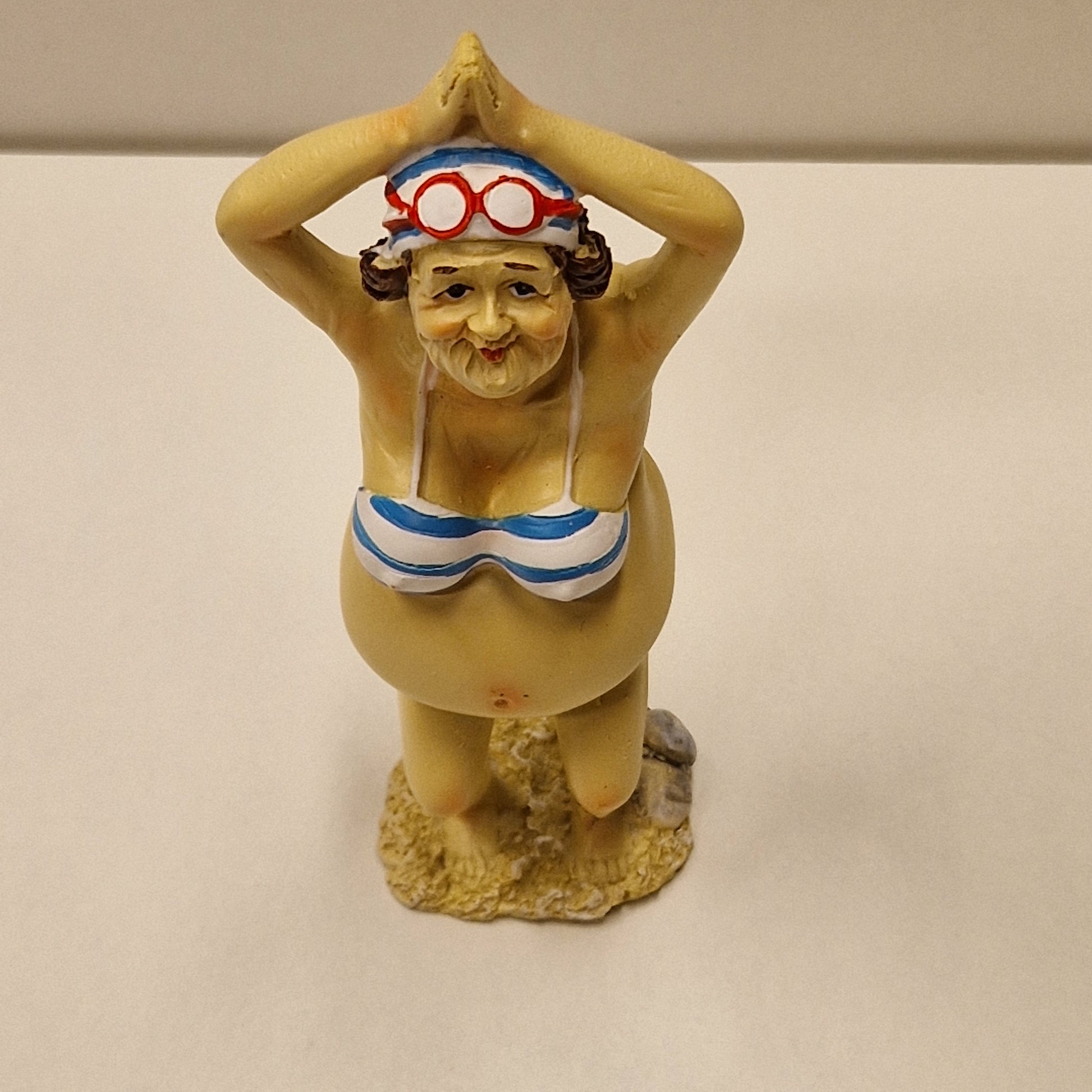 Sjarmerende eldre badedame med glimt i øye. 1 av 4 bedårende figurer i en serie av eldre damer i bikini. Damene har en fantastisk figur, en figur som de fleste kan kjenne igjen. Bare av å se denne gjengen, blir du i godt humør.