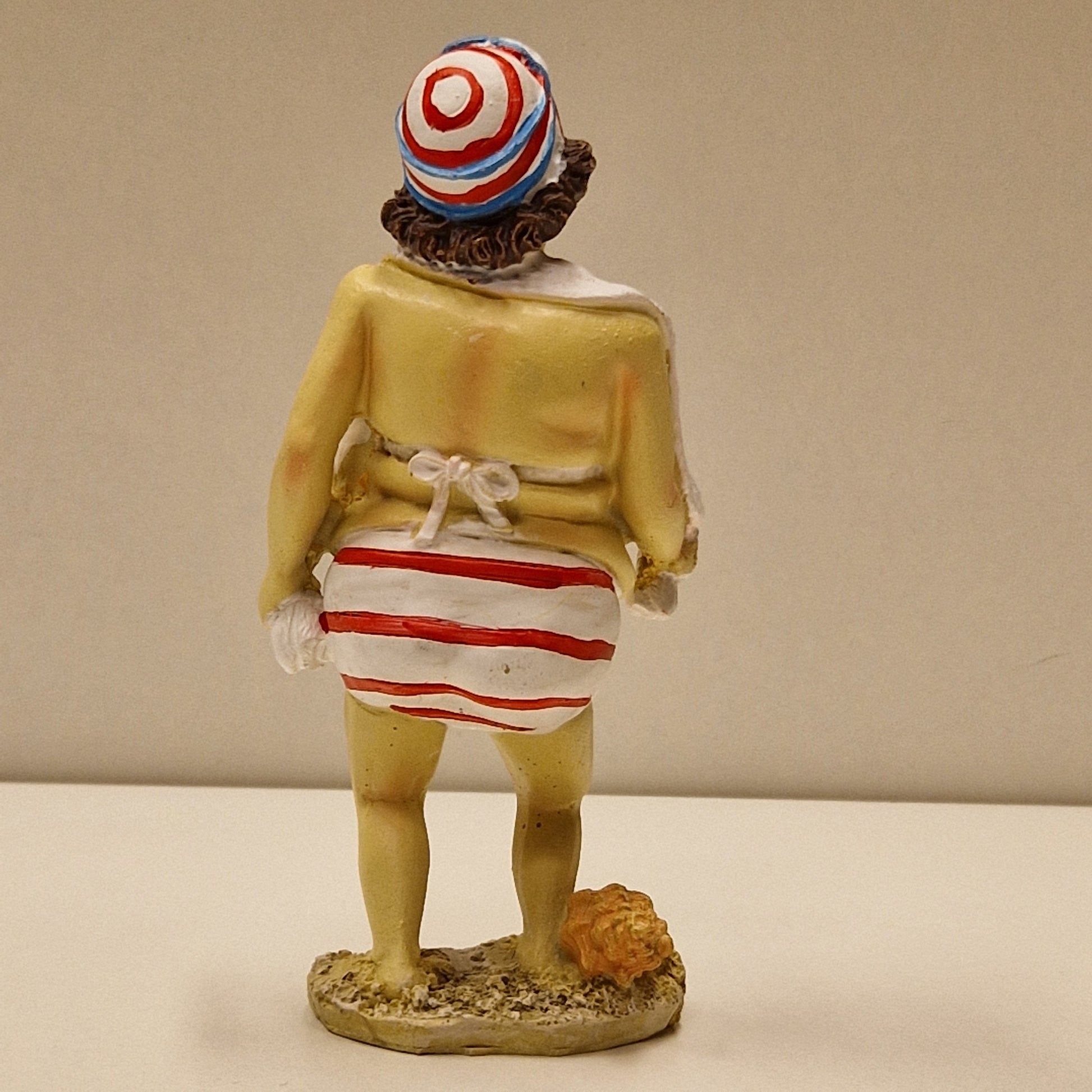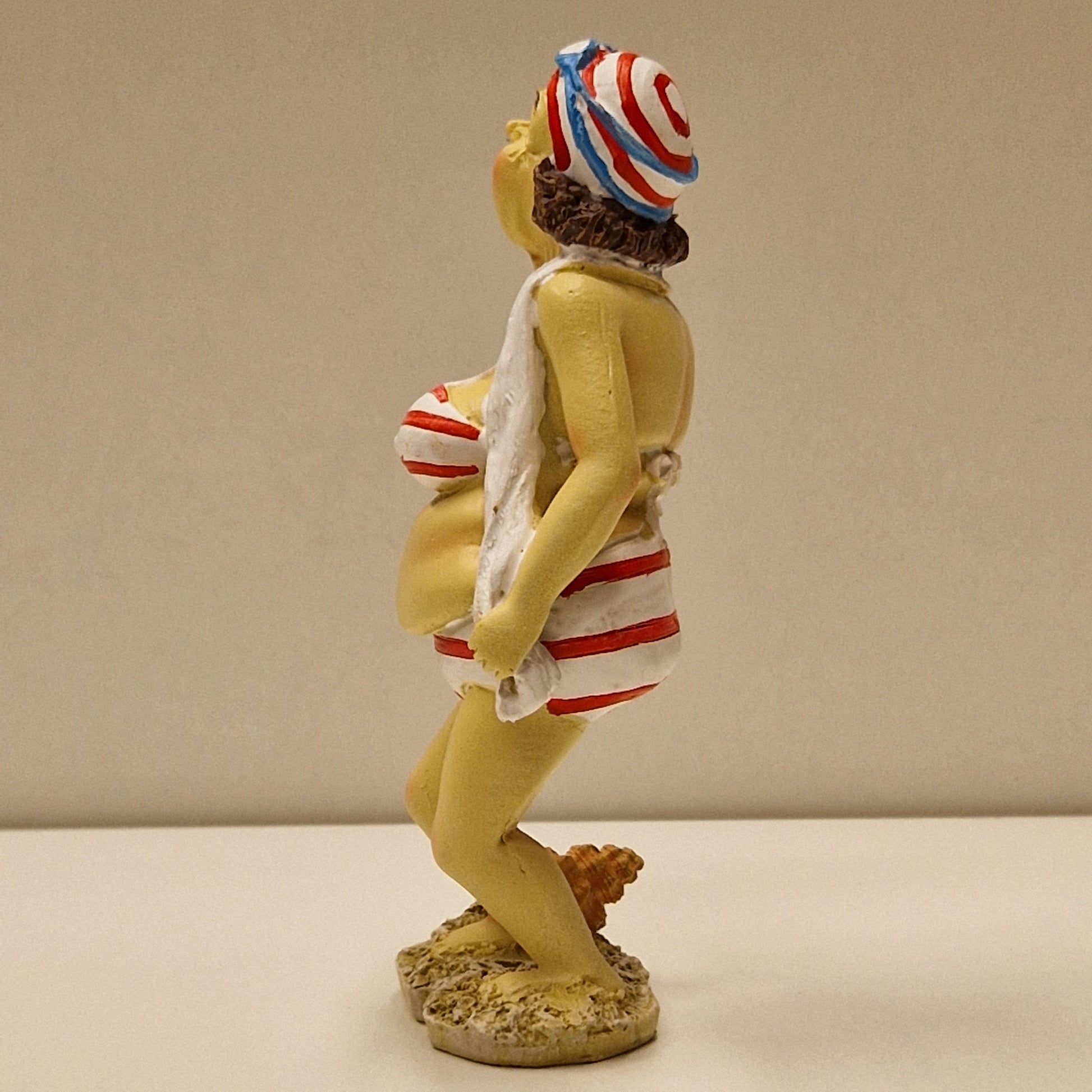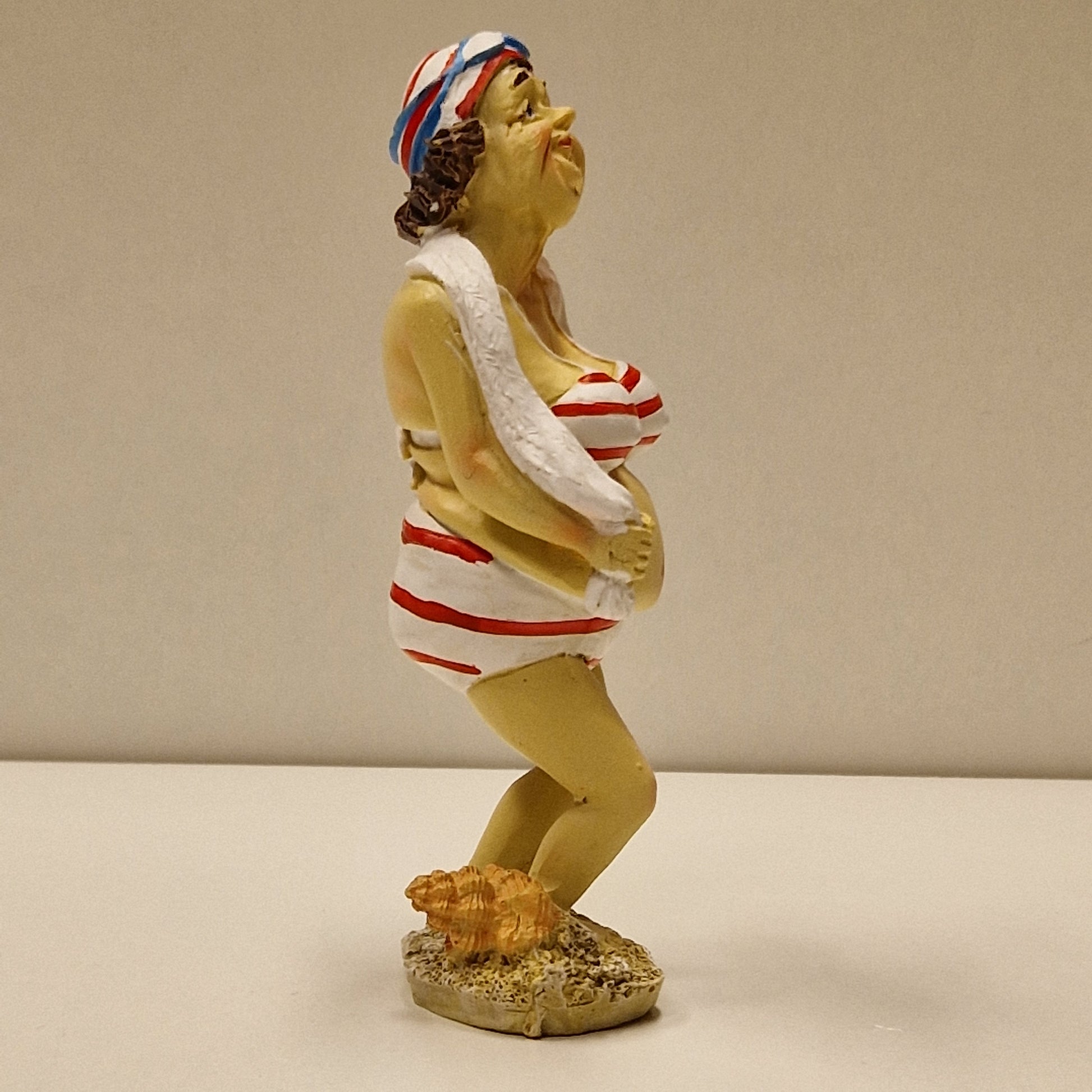 Sjarmerende eldre badedame med glimt i øye. 1 av 4 bedårende figurer i en serie av eldre damer i bikini. Damene har en fantastisk figur, en figur som de fleste kan kjenne igjen. Bare av å se denne gjengen, blir du i godt humør.