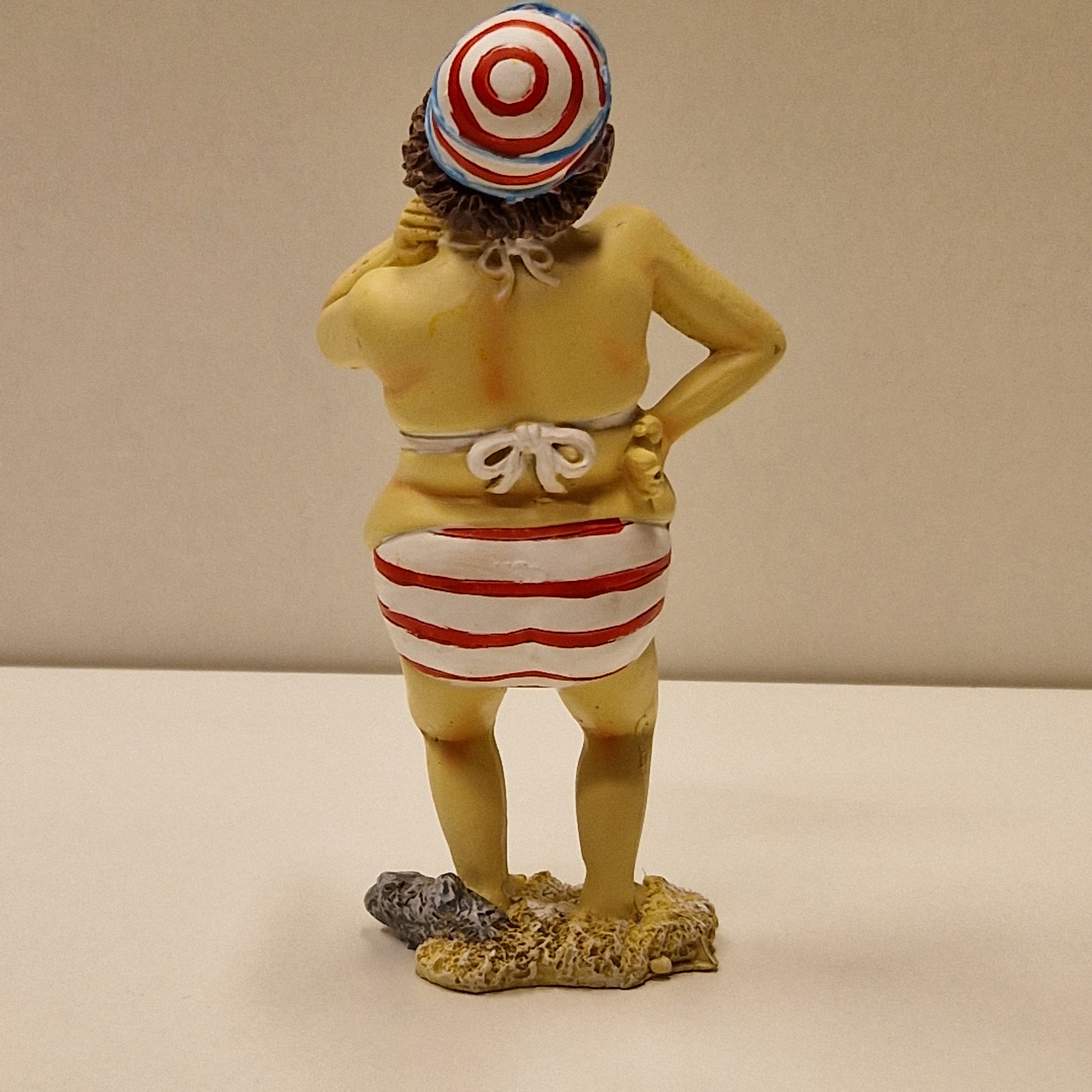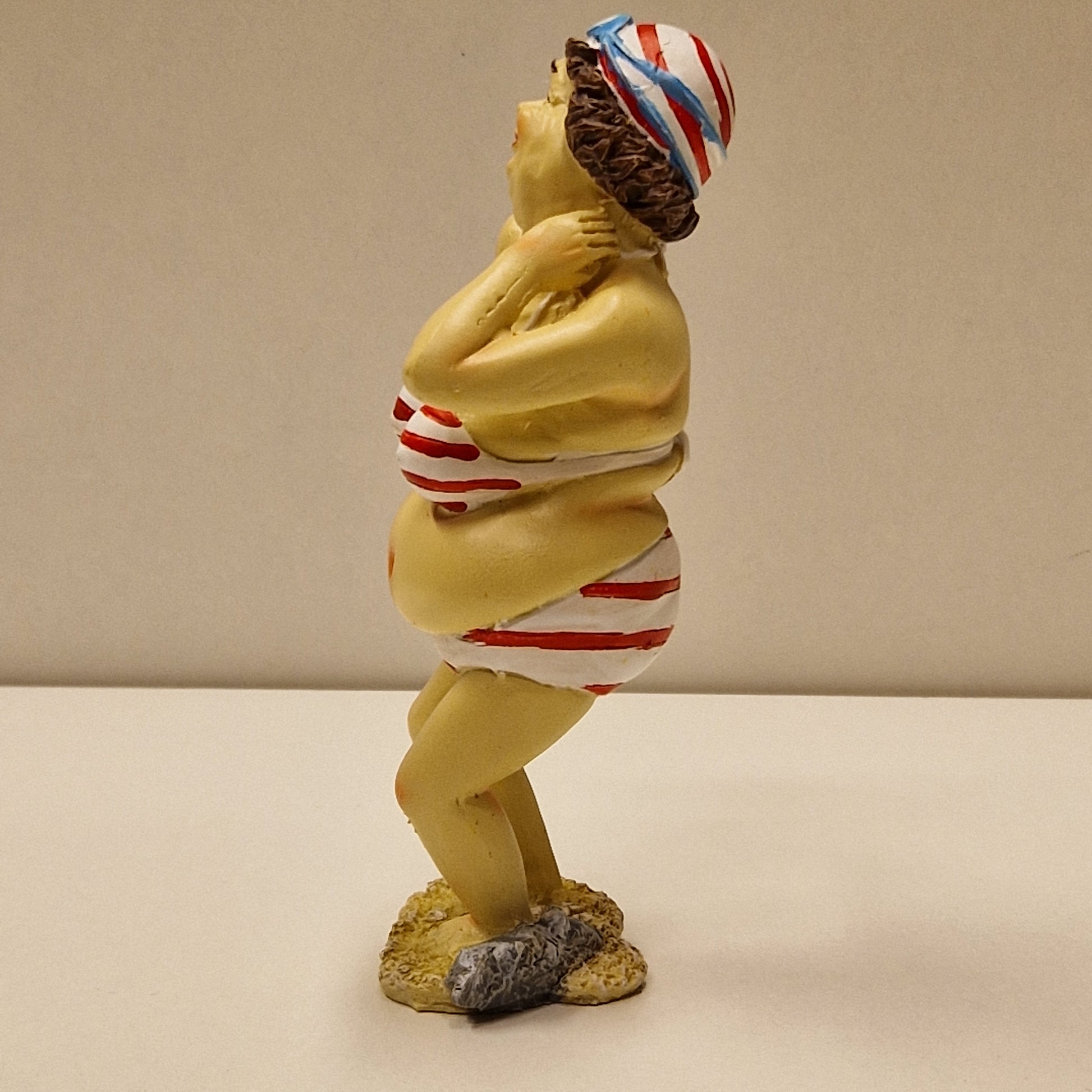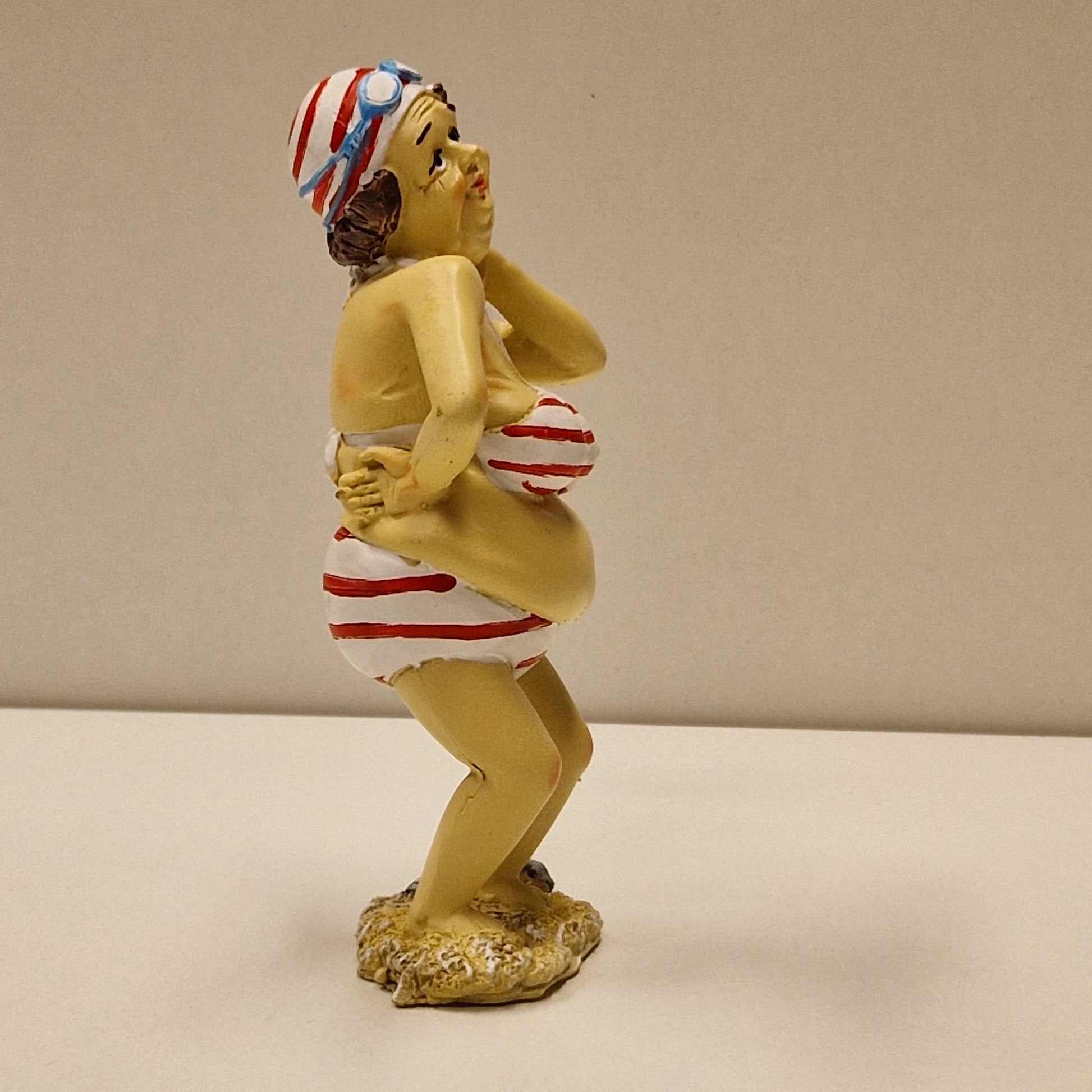 Sjarmerende eldre badedame med glimt i øye. 1 av 4 bedårende figurer i en serie av eldre damer i bikini. Damene har en fantastisk figur, en figur som de fleste kan kjenne igjen. Bare av å se denne gjengen, blir du i godt humør.